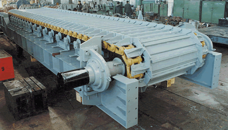 采用節(jié)距為228.6mm9吋)的高強(qiáng)度推土機(jī)模鍛鏈條為牽引件,兩根鏈條繞過安裝在機(jī)體頭部的一對(duì)驅(qū)動(dòng)鏈輪和機(jī)體尾部的一對(duì)張緊輪聯(lián)成封閉形回路,在兩排鏈條的每個(gè)鏈節(jié)上裝配了相互交迭的、重型結(jié)構(gòu)的輸送槽而成為一個(gè)連續(xù)的能夠運(yùn)載物料的輸送線路。其自重和物料的重量由安裝在機(jī)體上的多排支重輪、鏈托輪和滑道梁支承。傳動(dòng)系統(tǒng)經(jīng)交流變頻調(diào)速電動(dòng)機(jī)聯(lián)接減速機(jī),再由漲套與驅(qū)動(dòng)裝置直聯(lián)驅(qū)動(dòng)運(yùn)載機(jī)構(gòu)低速運(yùn)行。將尾部料倉卸入的物料沿輸送線路運(yùn)至機(jī)體的前方排出,實(shí)現(xiàn)向下方的工作機(jī)械連續(xù)均勻喂料的目的。
